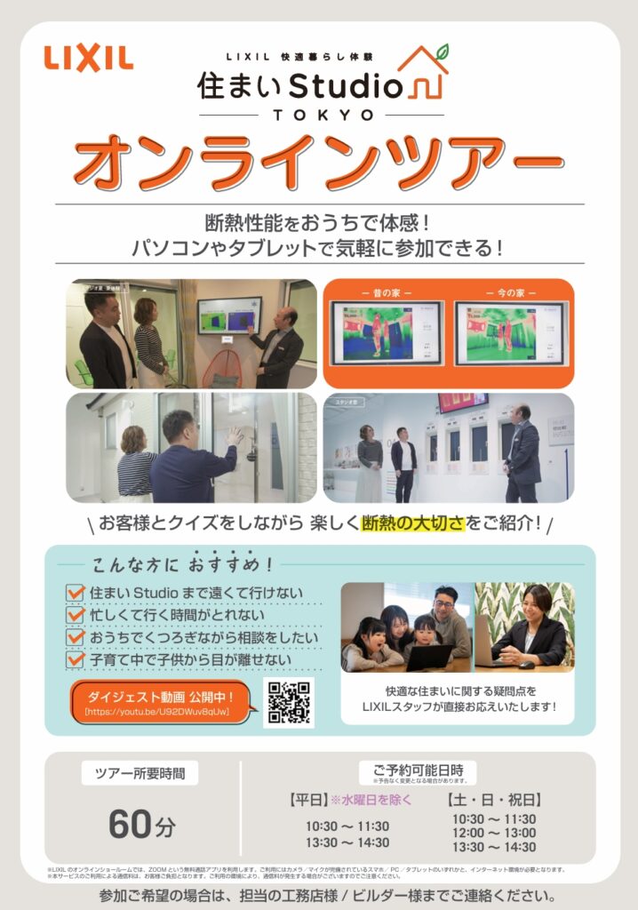 当社では、スーパーウォールの断熱性能を実際に体感できる、住まいスタジオをご案内しています。大阪まで行けない方にはオンラインツアーもごさいますので、お問い合わせください。